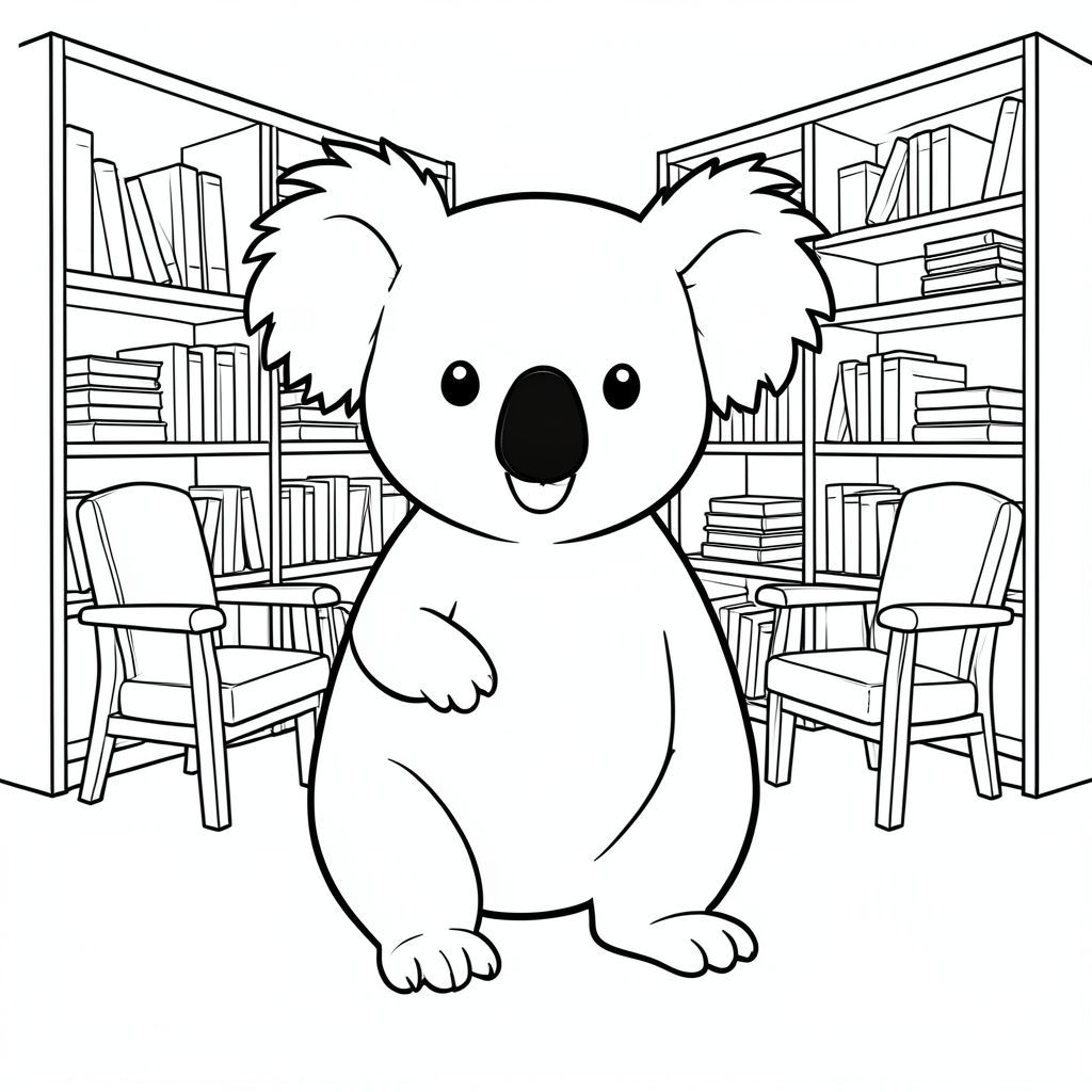 solo, chủ đề đơn, một đầu, hai mắt, hai tai, bốn chân, một đuôi, tỷ lệ tự nhiên, quy mô thích hợp trong môi trường, đúng giải phẫu, Koala, giá sách, kệ, ngăn xếp, tràn, ghế đọc, mềm, mờ, yên tĩnh, ấm cúng, đơn giản, trang màu, nghệ thuật đường, nền trắng, solo, chủ đề đơn, đúng về mặt giải phẫu, giải phẫu hoàn hảo