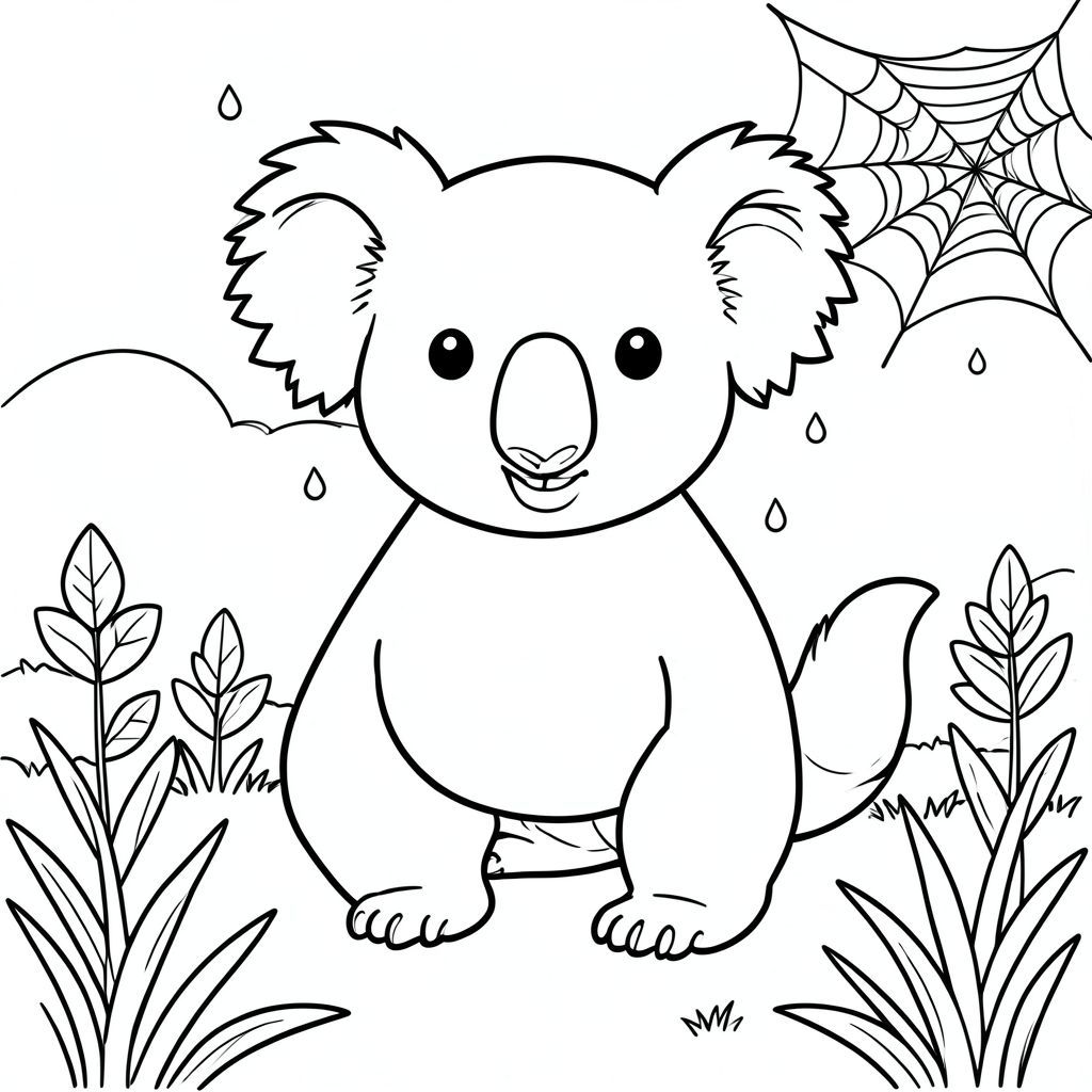 solo, chủ đề đơn, một đầu, hai mắt, hai tai, bốn chân, một đuôi, tỷ lệ tự nhiên, quy mô thích hợp trong môi trường, đúng giải phẫu, Koala, giọt sương, mạng nhện, cỏ, buổi sáng, ánh sáng mặt trời, bầu trời quang đãng, nền đơn giản, dọn dẹp, lá, tán lá, trang màu, nghệ thuật đường, nền trắng, solo, chủ đề đơn, chính xác về mặt giải phẫu, giải phẫu hoàn hảo