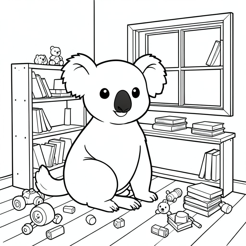 solo, chủ đề đơn, một đầu, hai mắt, hai tai, bốn chân, một đuôi, tỷ lệ tự nhiên, quy mô thích hợp trong môi trường, đúng giải phẫu, Koala, Kệ đồ chơi, Chỗ ngồi cửa sổ, sàn gỗ, phòng đơn giản, không gian nhỏ, ấm cúng, thoải mái, sách, đồ chơi rải rác, xem rõ ràng, trang màu, nghệ thuật đường, nền trắng, solo, chủ đề đơn, đúng giải phẫu, giải phẫu hoàn hảo