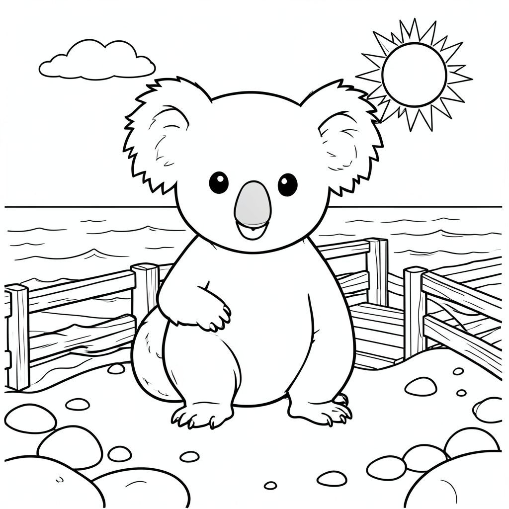 solo, chủ đề đơn, một đầu, hai mắt, hai tai, bốn chân, một đuôi, tỷ lệ tự nhiên, quy mô thích hợp trong môi trường, đúng giải phẫu, Koala, mặt trời, bờ biển, lối đi lát ván, lan can gỗ, bầu trời quang đãng, cát, đại dương, sóng, bờ biển, đá mịn, trang màu, nghệ thuật đường, nền trắng, solo, chủ đề đơn, đúng về mặt giải phẫu, giải phẫu hoàn hảo