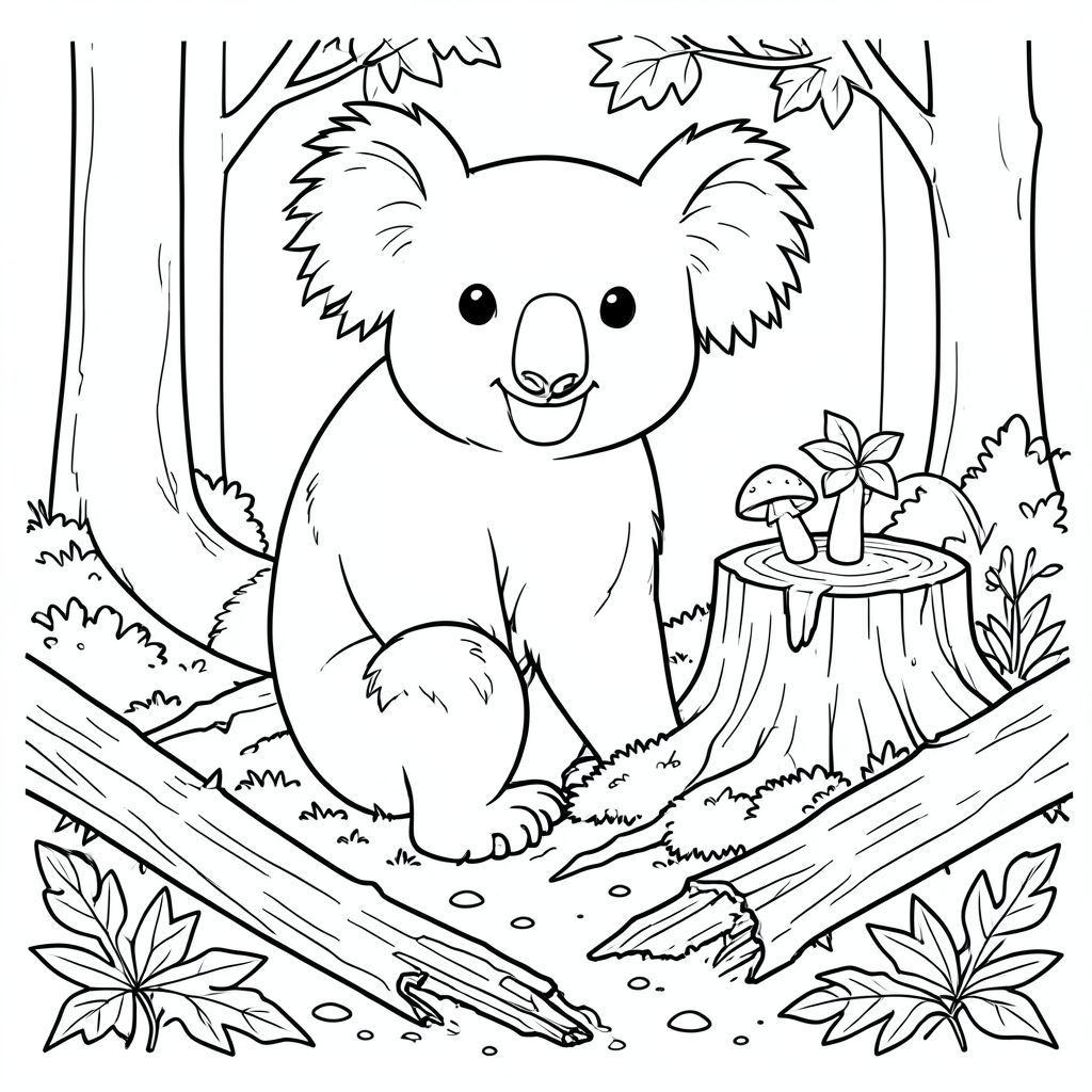 solo, chủ đề đơn, một đầu, hai mắt, hai tai, bốn chân, một đuôi, tỷ lệ tự nhiên, quy mô thích hợp trong môi trường, đúng giải phẫu, Koala, miếng dán nấm, gốc cây mục nát, rừng mùa thu ẩm ướt, lá, ánh sáng mặt trời, rêu, rễ, gỗ rơi, nhỏ, đơn giản, trang màu, nghệ thuật đường, nền trắng, solo, chủ đề đơn, đúng giải phẫu, giải phẫu hoàn hảo