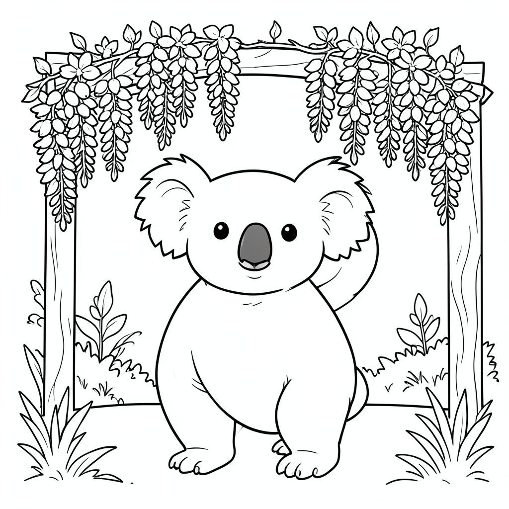 solo, chủ đề đơn, một đầu, hai mắt, hai tai, bốn chân, một đuôi, tỷ lệ tự nhiên, quy mô thích hợp trong môi trường, đúng giải phẫu, Koala, Pergola, hoa tử đằng, nở hoa, cụm treo, vườn, ánh sáng mặt trời, nền đơn giản, dọn dẹp, hình minh họa, sách truyện, trang tô màu, nghệ thuật đường, nền trắng, solo, chủ đề đơn, đúng giải phẫu, giải phẫu hoàn hảo