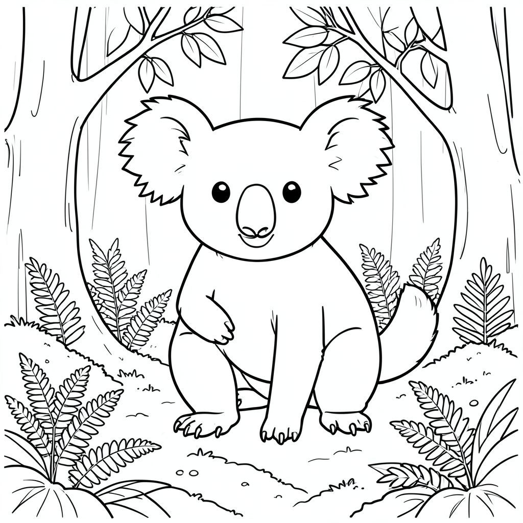 solo, chủ đề đơn, một đầu, hai mắt, hai tai, bốn chân, một đuôi, tỷ lệ tự nhiên, quy mô thích hợp trong môi trường, đúng giải phẫu, Koala, rừng, ánh sáng mặt trời, lốm đốm, lá, chi nhánh, bụi rậm, rêu, dương xỉ, rõ ràng, đơn giản, tô màu, nghệ thuật đường, nền trắng, solo, chủ đề đơn, chính xác về mặt giải phẫu, giải phẫu hoàn hảo