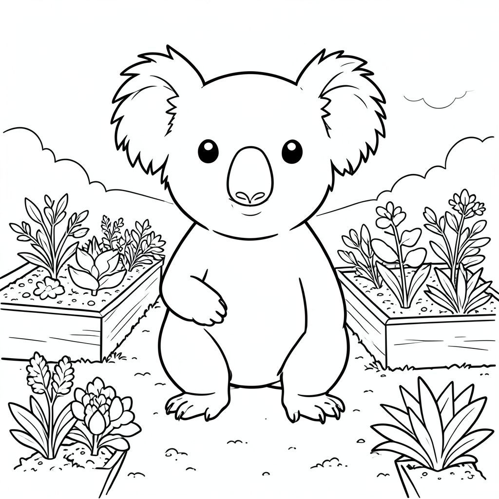 solo, chủ đề đơn, một đầu, hai mắt, hai tai, bốn chân, một đuôi, tỷ lệ tự nhiên, quy mô thích hợp trong môi trường, đúng giải phẫu, Koala, vườn, giường nâng, rau, đất, ánh sáng mặt trời, đơn giản, lý lịch, dọn dẹp, hòa bình, yên tĩnh, trang màu, nghệ thuật đường, nền trắng, solo, chủ đề đơn, đúng về mặt giải phẫu, giải phẫu hoàn hảo