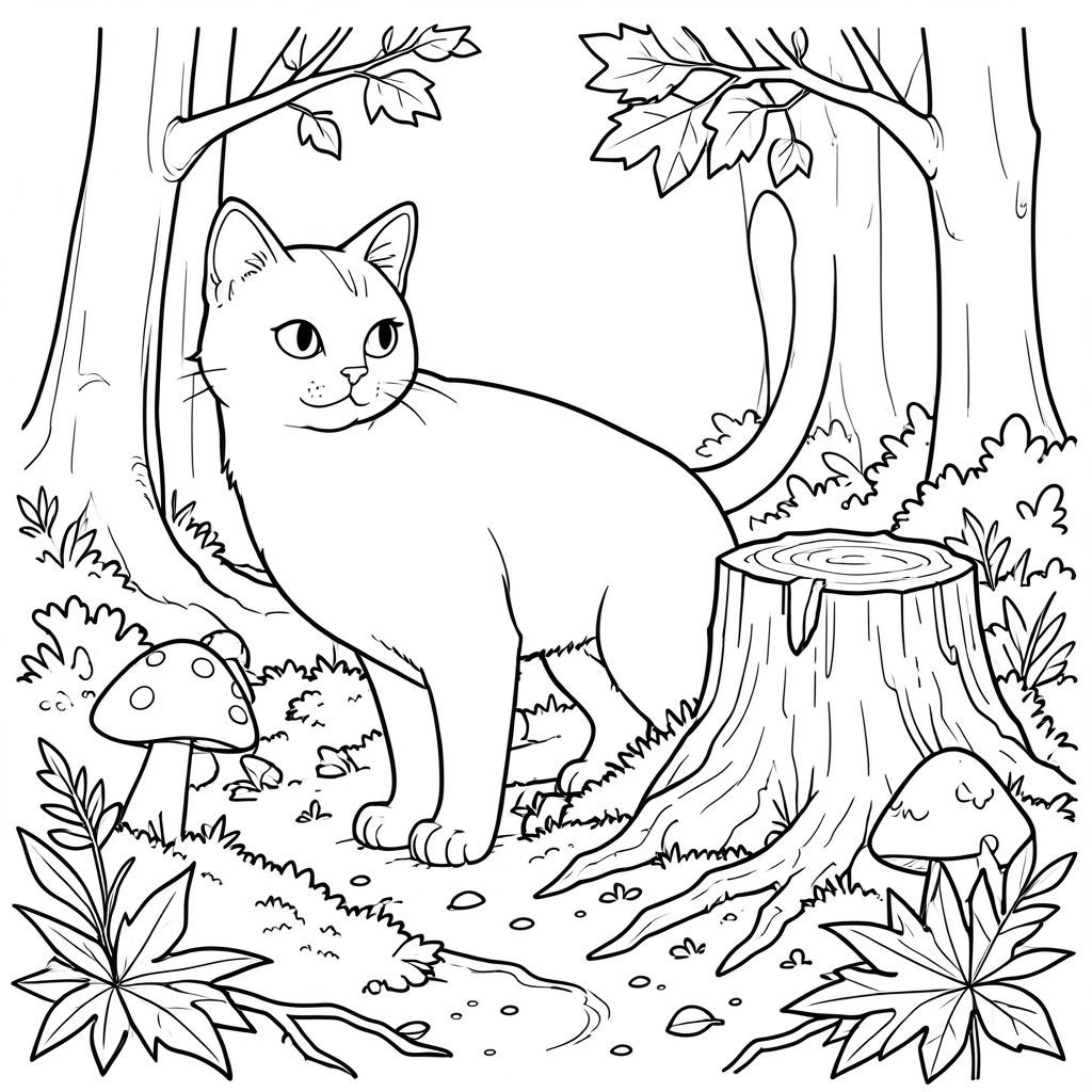 solo, chủ đề đơn, một đầu, hai mắt, hai tai, bốn chân, một đuôi, tỷ lệ tự nhiên, quy mô thích hợp trong môi trường, đúng giải phẫu, mèo, vá nấm, gốc cây mục nát, rừng ẩm, mùa thu, lá, ánh sáng mặt trời, đất, rêu, rễ, gỗ, trang màu, nghệ thuật đường, nền trắng, solo, chủ đề đơn, đúng giải phẫu, giải phẫu hoàn hảo