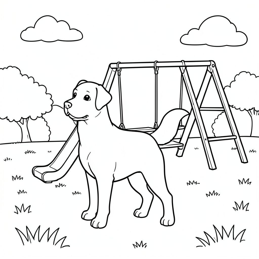 solo, chủ đề đơn, một đầu, hai mắt, hai tai, bốn chân, một đuôi, tỷ lệ tự nhiên, quy mô thích hợp trong môi trường, đúng giải phẫu,, sân chơi, xích đu, cầu trượt, công viên cỏ, nắng, bầu trời quang đãng, cỏ, đơn giản, sạch sẽ, tuyến tính, trang màu, nghệ thuật đường, nền trắng, solo, chủ đề đơn, đúng về mặt giải phẫu, giải phẫu hoàn hảo