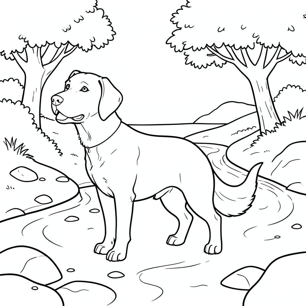 solo, chủ đề đơn, một đầu, hai mắt, hai tai, bốn chân, một đuôi, tỷ lệ tự nhiên, quy mô thích hợp trong môi trường, đúng giải phẫu,, Sông, uốn cong, cát, ngân hàng, cây, ánh sáng mặt trời, rõ ràng, mịn, ướt, đá, trang màu, nghệ thuật đường, nền trắng, solo, chủ đề đơn, đúng về mặt giải phẫu, giải phẫu hoàn hảo