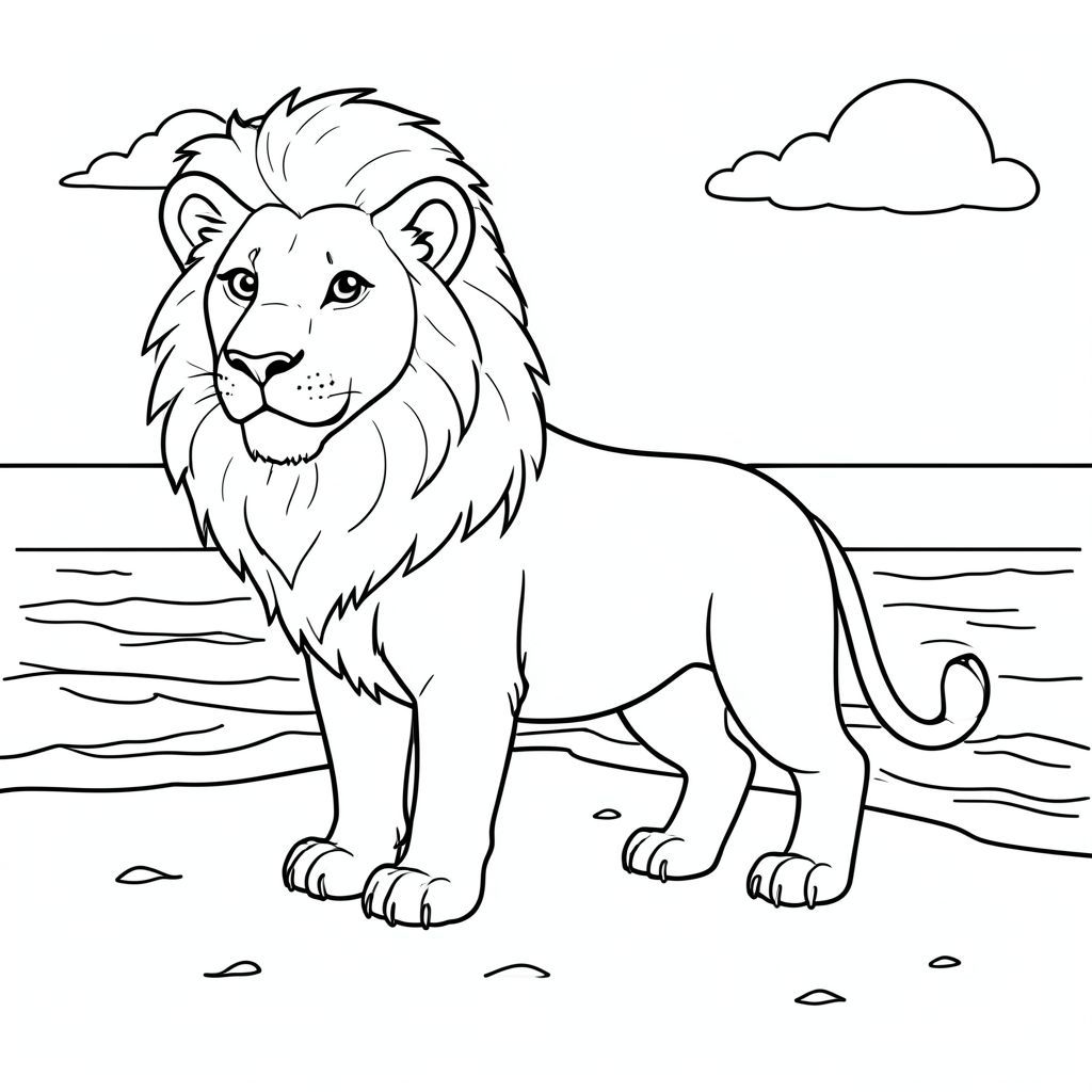 solo, chủ đề đơn, một đầu, hai mắt, hai tai, bốn chân, một đuôi, tỷ lệ tự nhiên, quy mô thích hợp trong môi trường, đúng giải phẫu, sư tử, Bãi biển cát, cát, Nước, bầu trời quang đãng, ánh sáng mặt trời, sóng, bờ biển, nhỏ, đơn giản, sạch sẽ, trang màu, nghệ thuật đường, nền trắng, solo, chủ đề đơn, đúng về mặt giải phẫu, giải phẫu hoàn hảo