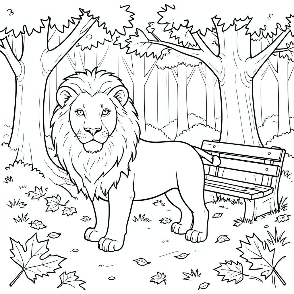solo, chủ đề đơn, một đầu, hai mắt, hai tai, bốn chân, một đuôi, tỷ lệ tự nhiên, quy mô thích hợp trong môi trường, đúng giải phẫu, sư tử, cây sồi, băng ghế công viên, lá mùa thu, lá rụng, ánh sáng mặt trời, lý lịch, rừng, con đường, cỏ, bụi bẩn, trang màu, nghệ thuật đường, nền trắng, solo, chủ đề đơn, đúng giải phẫu, giải phẫu hoàn hảo