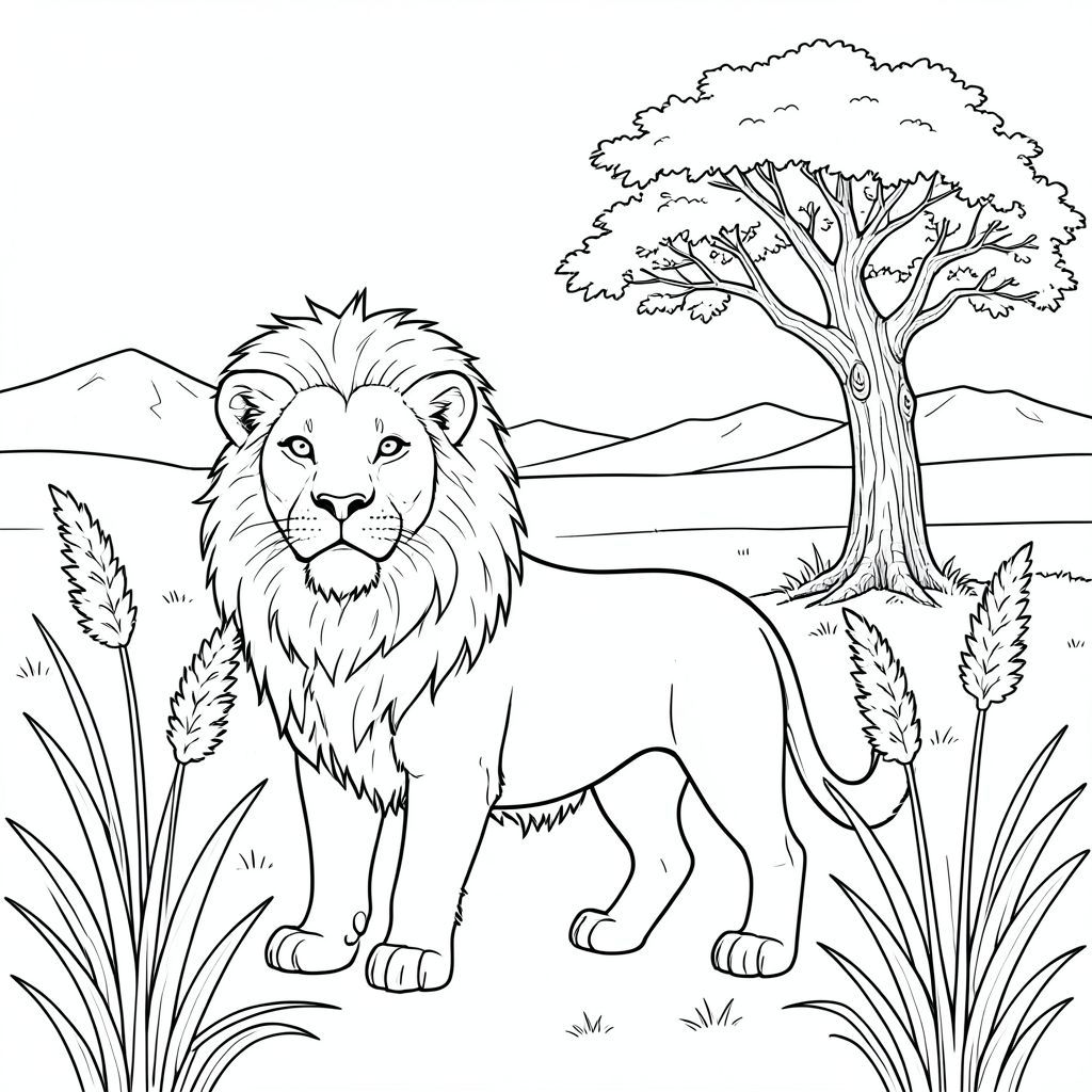solo, chủ đề đơn, một đầu, hai mắt, hai tai, bốn chân, một đuôi, tỷ lệ tự nhiên, quy mô thích hợp trong môi trường, đúng giải phẫu, sư tử, cỏ Pampas, thân cây cao, gió thổi, rộng lớn, cây cô đơn, gỗ phong hóa, ánh sáng mặt trời, bầu trời quang đãng, bầu trời, những ngọn núi xa xôi, trang màu, nghệ thuật đường, nền trắng, solo, chủ đề đơn, chính xác về mặt giải phẫu, giải phẫu hoàn hảo