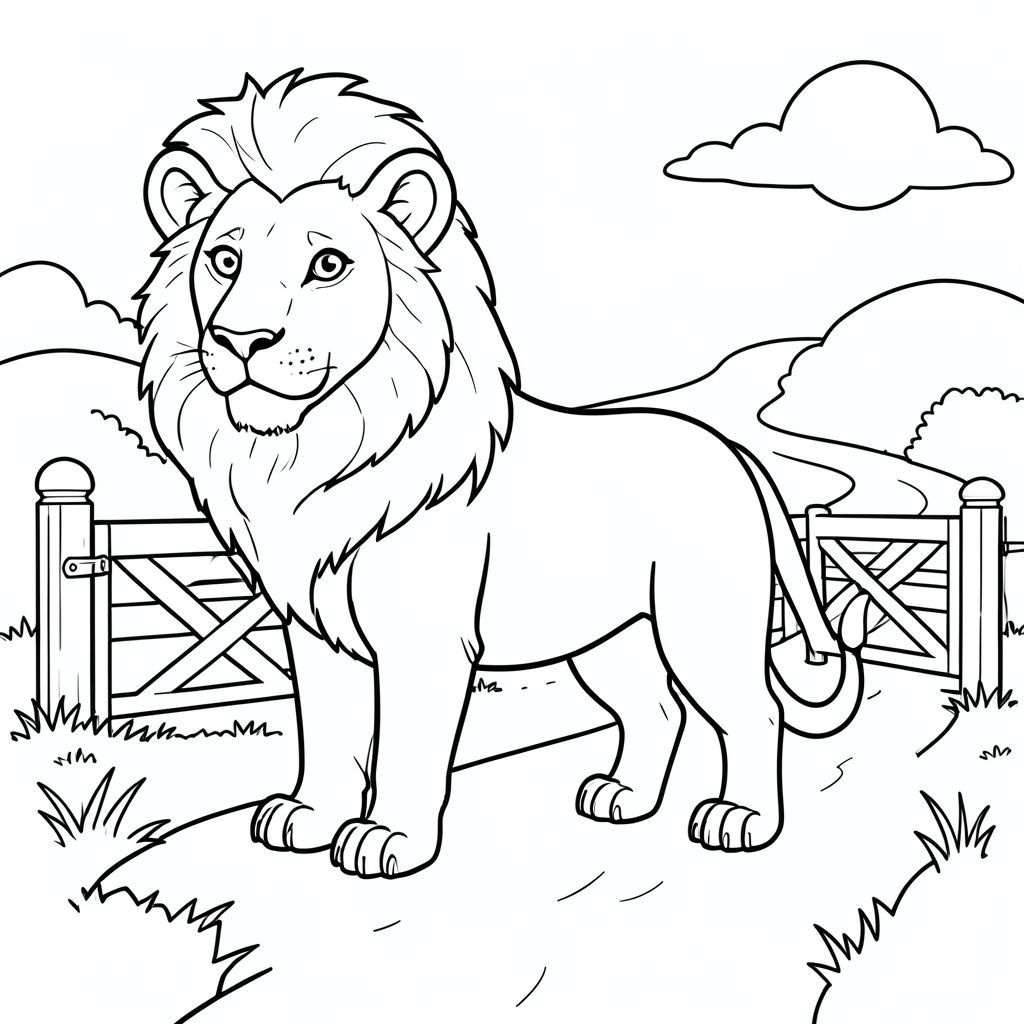solo, chủ đề đơn, một đầu, hai mắt, hai tai, bốn chân, một đuôi, tỷ lệ tự nhiên, quy mô thích hợp trong môi trường, đúng giải phẫu, sư tử, Cổng trang trại, làn đường quanh co, đường nông thôn, nền đơn giản, dọn dẹp, phong cảnh, nông thôn, nhỏ, đẹp như tranh vẽ, Ánh sáng mặt trời, trang tô màu, nghệ thuật đường, nền trắng, solo, chủ đề đơn, chính xác về mặt giải phẫu, giải phẫu hoàn hảo