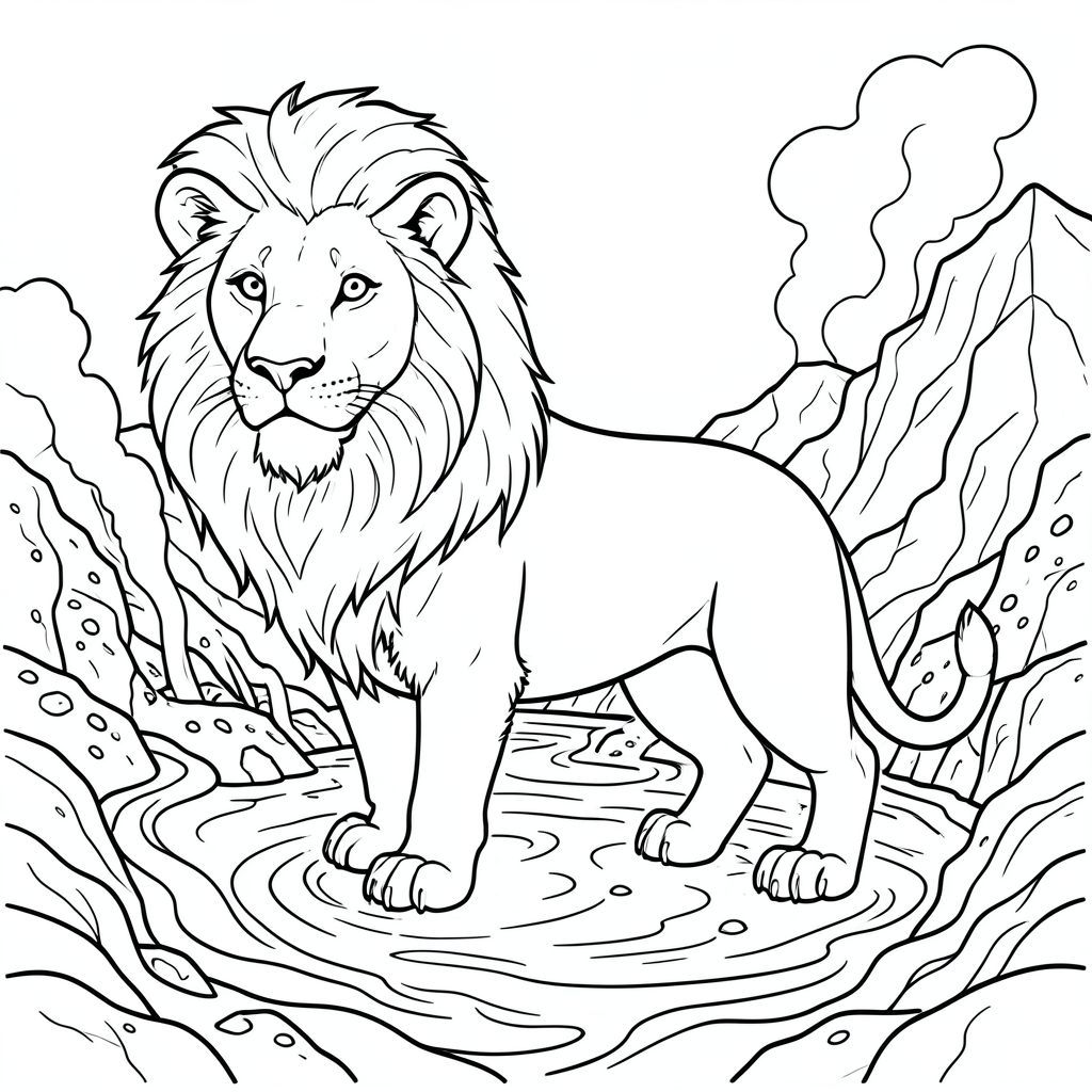 solo, chủ đề đơn, một đầu, hai mắt, hai tai, bốn chân, một đuôi, tỷ lệ tự nhiên, quy mô thích hợp trong môi trường, đúng giải phẫu, sư tử, Địa nhiệt, suối nước nóng, lỗ thông hơi, đá núi lửa, trầm tích khoáng sản, hoa văn xoáy, mãnh liệt, siêu thực, giống như mơ, phong cảnh, trang màu, nghệ thuật đường, nền trắng, solo, chủ đề đơn, đúng giải phẫu, giải phẫu hoàn hảo
