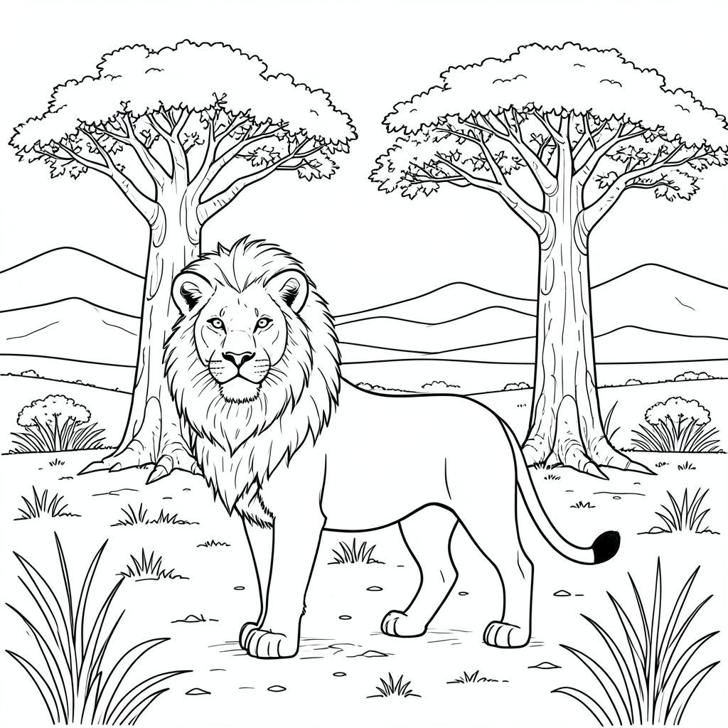 solo, chủ đề đơn, một đầu, hai mắt, hai tai, bốn chân, một đuôi, tỷ lệ tự nhiên, quy mô thích hợp trong môi trường, đúng giải phẫu, sư tử, đồng bằng châu Phi, cây bao báp, thân cây đồ sộ, phong cảnh khô cằn, đồng bằng đầy nắng, rộng lớn, đồi thoai thoải, núi xa, trái đất kết cấu, cỏ khô, tô màu, nghệ thuật đường, nền trắng, solo, chủ đề đơn, đúng về mặt giải phẫu, giải phẫu hoàn hảo