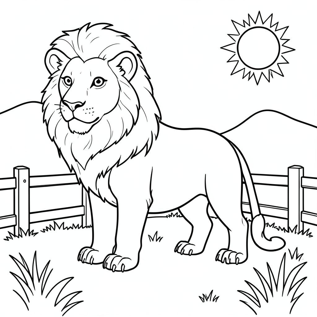 solo, chủ đề đơn, một đầu, hai mắt, hai tai, bốn chân, một đuôi, tỷ lệ tự nhiên, quy mô thích hợp trong môi trường, đúng giải phẫu, sư tử, đồng cỏ, lăn, hàng rào đơn giản, bằng gỗ, dọn dẹp, lý lịch, đơn giản, môi trường, mặt trời, cỏ, tô màu, nghệ thuật đường, nền trắng, solo, chủ đề đơn, đúng về mặt giải phẫu, giải phẫu hoàn hảo