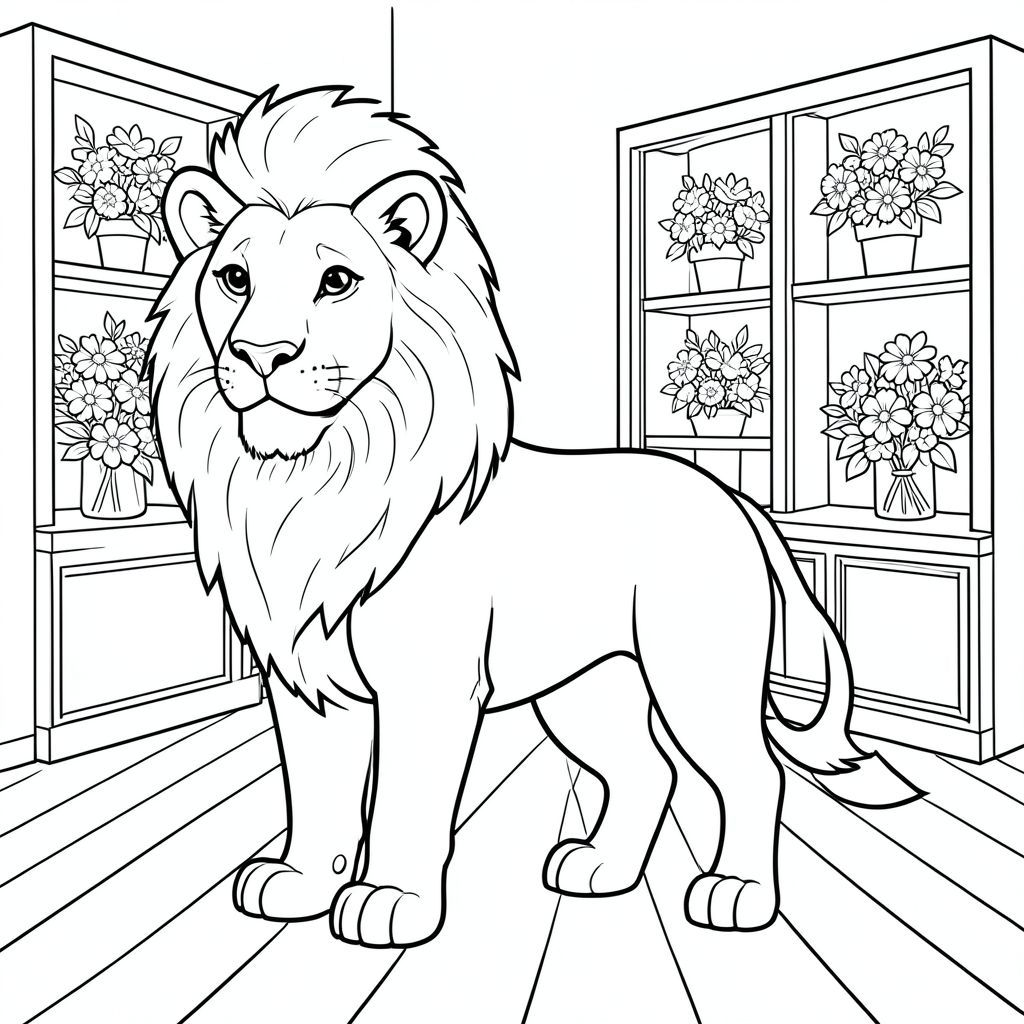 solo, chủ đề đơn, một đầu, hai mắt, hai tai, bốn chân, một đuôi, tỷ lệ tự nhiên, quy mô thích hợp trong môi trường, đúng giải phẫu, sư tử, hoa, bó hoa, cửa sổ cửa hàng, kệ, sàn gỗ, dọn dẹp, đơn giản, lý lịch, mềm mại, hình học, trang tô màu, nghệ thuật đường, nền trắng, solo, chủ đề đơn, đúng về mặt giải phẫu, giải phẫu hoàn hảo