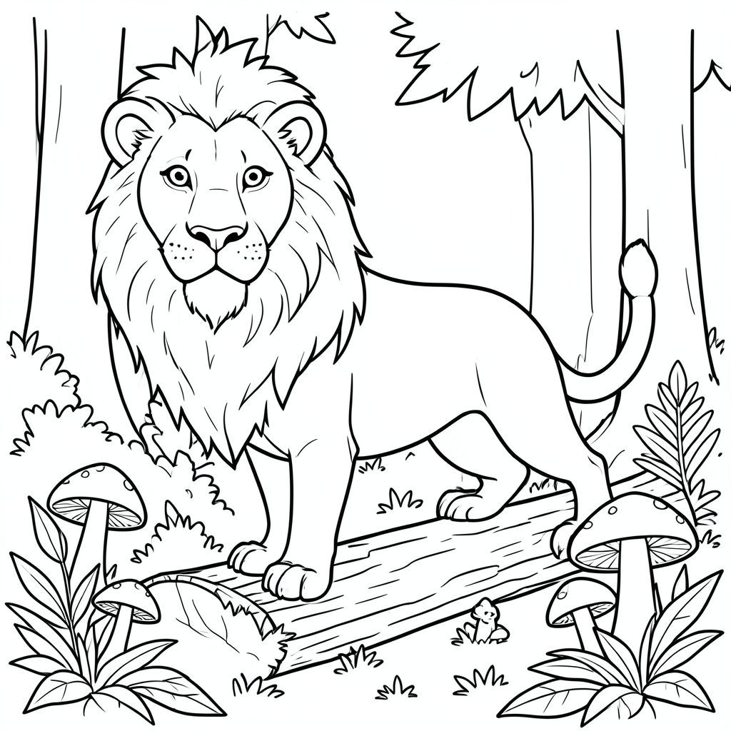 solo, chủ đề đơn, một đầu, hai mắt, hai tai, bốn chân, một đuôi, tỷ lệ tự nhiên, quy mô thích hợp trong môi trường, đúng giải phẫu, sư tử, Rừng, khúc gỗ rỗng, nấm, vỏ cây, lá, ánh sáng mặt trời, nền đơn giản, sạch sẽ, thuần khiết, trang màu, nghệ thuật đường, nền trắng, solo, chủ đề đơn, đúng về mặt giải phẫu, giải phẫu hoàn hảo