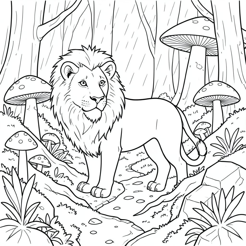 solo, chủ đề đơn, một đầu, hai mắt, hai tai, bốn chân, một đuôi, tỷ lệ tự nhiên, quy mô thích hợp trong môi trường, đúng giải phẫu, sư tử, Rừng pha lê, nấm, nấm khổng lồ, rêu, đá, rễ, con đường, chiều sâu, phối cảnh, mưa, trang màu, nghệ thuật đường, nền trắng, solo, chủ đề đơn, đúng về mặt giải phẫu, giải phẫu hoàn hảo
