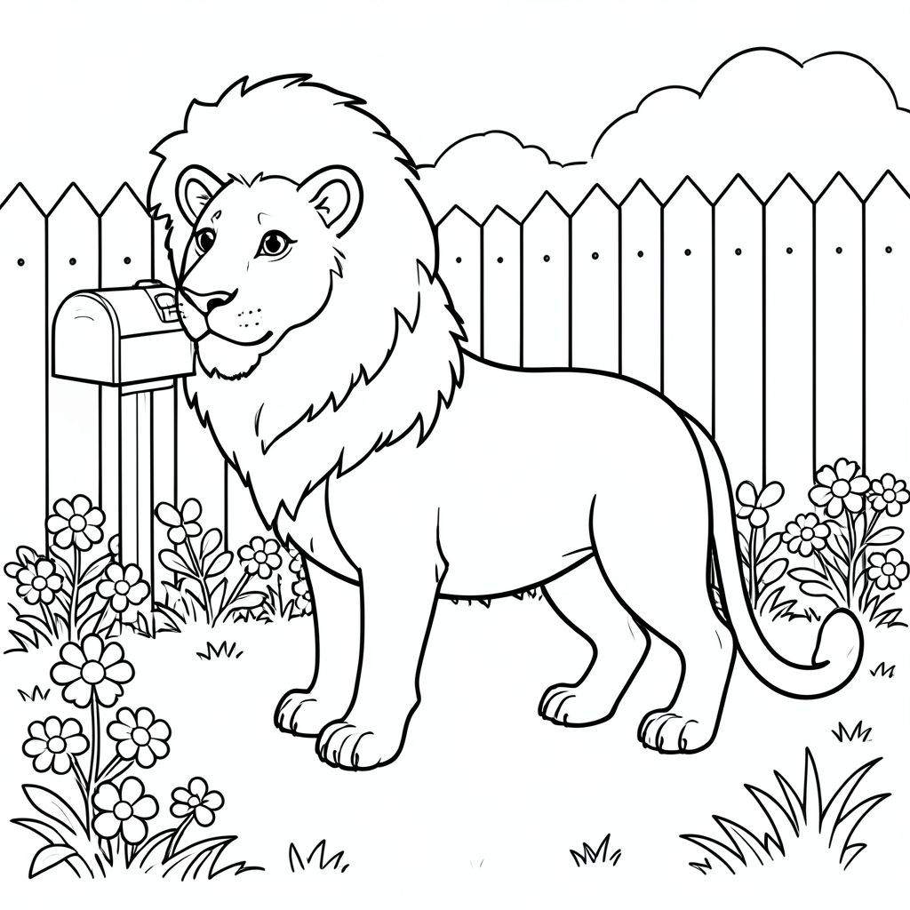solo, chủ đề đơn, một đầu, hai mắt, hai tai, bốn chân, một đuôi, tỷ lệ tự nhiên, quy mô thích hợp trong môi trường, đúng giải phẫu, sư tử, Sân trước, hộp thư, đường viền vườn, đơn giản, dọn dẹp, nắng, cỏ, hoa, hàng rào gỗ, nền đơn giản, trang màu, nghệ thuật đường, nền trắng, solo, chủ đề đơn, đúng về mặt giải phẫu, giải phẫu hoàn hảo