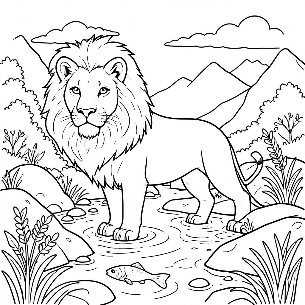 solo, chủ đề đơn, một đầu, hai mắt, hai tai, bốn chân, một đuôi, tỷ lệ tự nhiên, quy mô thích hợp trong môi trường, đúng giải phẫu, sư tử, suối núi, cải xoong, cá nhỏ, nước trong, đá, ánh sáng mặt trời, đá mịn, bầu trời, tán lá, dòng chảy nhẹ nhàng, trang màu, nghệ thuật đường nét, nền trắng, solo, chủ đề đơn, đúng giải phẫu, giải phẫu hoàn hảo