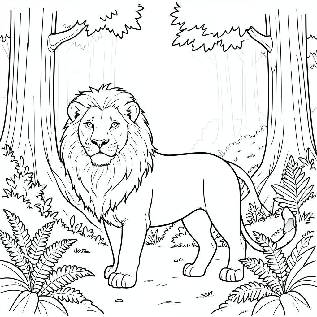 solo, chủ đề đơn, một đầu, hai mắt, hai tai, bốn chân, một đuôi, tỷ lệ tự nhiên, quy mô thích hợp trong môi trường, đúng giải phẫu, sư tử, sương mù, già cỗi, gỗ đỏ, cây cối, thân cây, dương xỉ, dày đặc, tán lá, ánh sáng mặt trời, lốm đốm, trang màu, nghệ thuật đường, nền trắng, solo, chủ đề đơn, chính xác về mặt giải phẫu, giải phẫu hoàn hảo