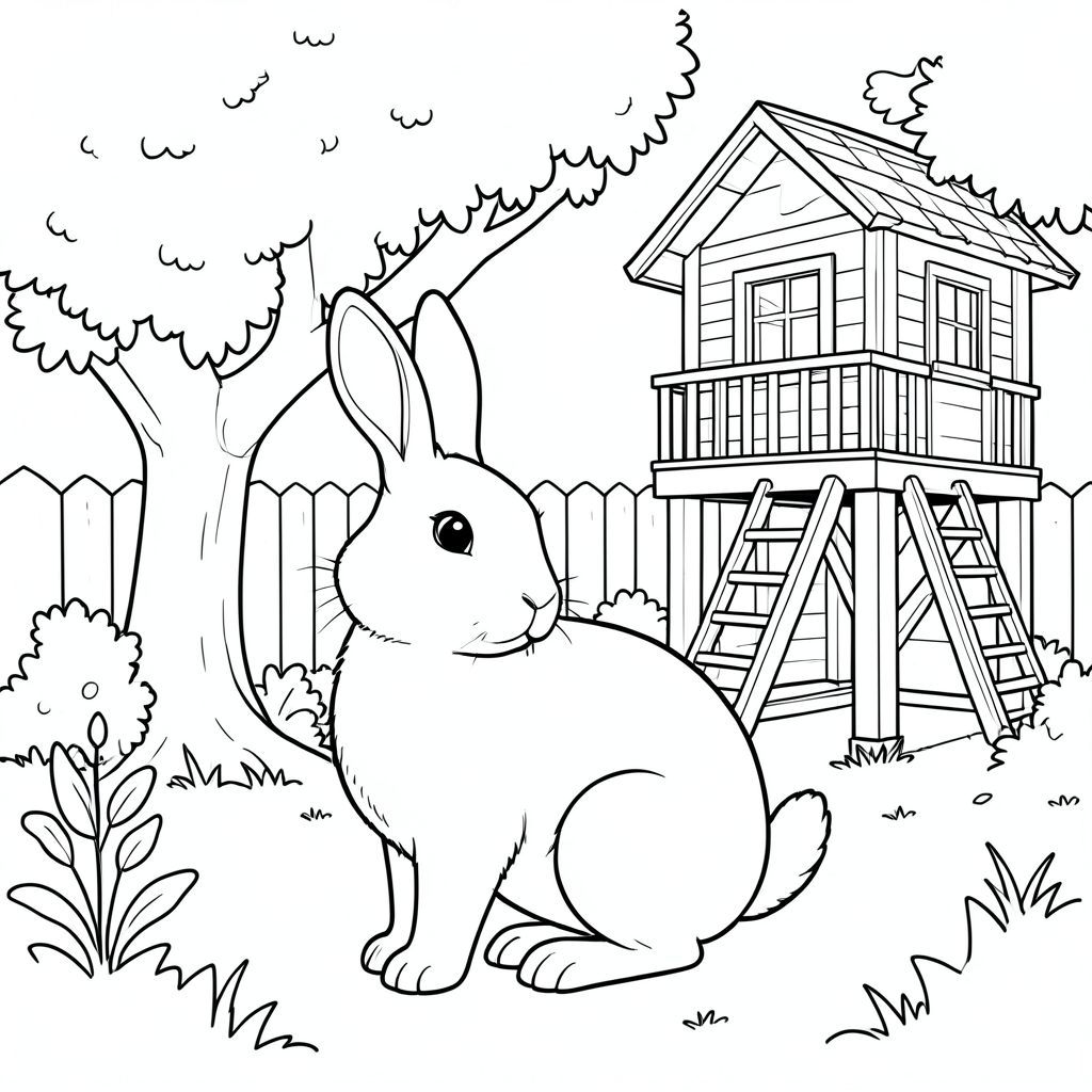 solo, chủ đề đơn, một đầu, hai mắt, hai tai, bốn chân, một đuôi, tỷ lệ tự nhiên, quy mô thích hợp trong môi trường, đúng giải phẫu, thỏ, cây, sân sau, lớn, vườn, nhà trên cây, thang, lan can, đơn giản, dọn dẹp, lý lịch, tô màu, nghệ thuật đường, nền trắng, solo, chủ đề đơn, đúng về mặt giải phẫu, giải phẫu hoàn hảo