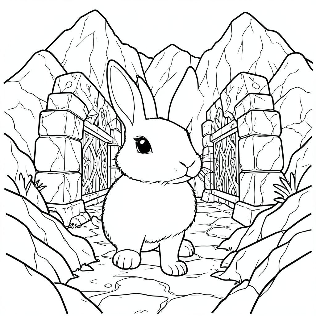 solo, chủ đề đơn, một đầu, hai mắt, hai tai, bốn chân, một đuôi, tỷ lệ tự nhiên, quy mô thích hợp trong môi trường, đúng giải phẫu, thỏ, cổng đá lớn, chạm khắc, phức tạp, chi tiết, thực tế, núi, lối vào, hang động, đá, con đường, trang màu, nghệ thuật đường, nền trắng, solo, chủ đề đơn, đúng giải phẫu, giải phẫu hoàn hảo