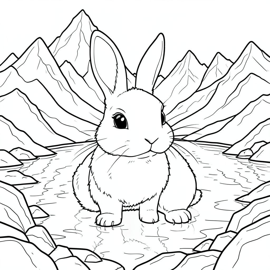 solo, chủ đề đơn, một đầu, hai mắt, hai tai, bốn chân, một đuôi, tỷ lệ tự nhiên, quy mô thích hợp trong môi trường, đúng giải phẫu, thỏ, hồ, băng giá, đỉnh răng cưa, núi, địa hình đá, tuyết, ánh sáng mặt trời, phản chiếu, chiều sâu, phối cảnh, trang màu, nghệ thuật đường, nền trắng, solo, chủ đề đơn, chính xác về mặt giải phẫu, giải phẫu hoàn hảo
