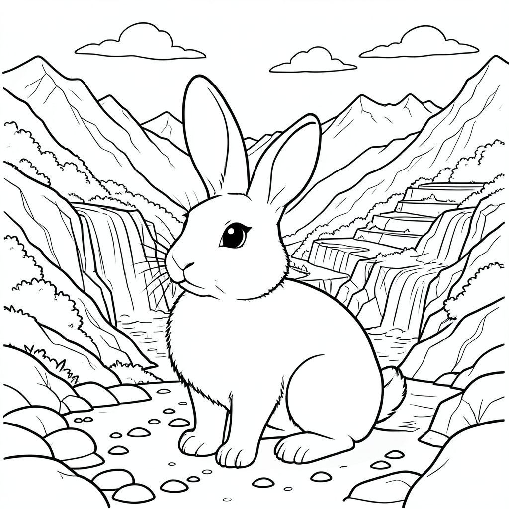 solo, chủ đề đơn, một đầu, hai mắt, hai tai, bốn chân, một đuôi, tỷ lệ tự nhiên, quy mô thích hợp trong môi trường, đúng giải phẫu, thỏ, hồ núi cao, thác nước xếp tầng, sườn đá, ruộng bậc thang xanh tươi, đỉnh núi xa, bầu trời u ám, đá mịn, băng băng, thung lũng, dốc nắng, trang màu, nghệ thuật đường, nền trắng, solo, chủ đề đơn, đúng về mặt giải phẫu, giải phẫu hoàn hảo