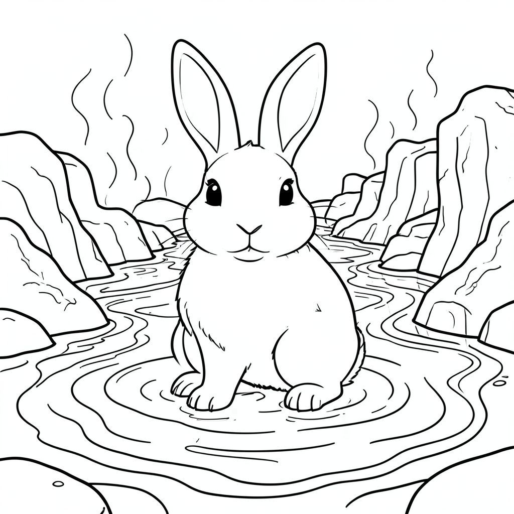 solo, chủ đề đơn, một đầu, hai mắt, hai tai, bốn chân, một đuôi, tỷ lệ tự nhiên, quy mô thích hợp trong môi trường, đúng giải phẫu, thỏ, suối nước nóng, trầm tích khoáng sản, nước hấp, nước nóng, hồ bơi, thành tạo đá, nước, hoa văn xoáy, phản chiếu, độ sâu, trang màu, nghệ thuật đường nét, nền trắng, solo, chủ đề đơn, đúng giải phẫu, giải phẫu hoàn hảo