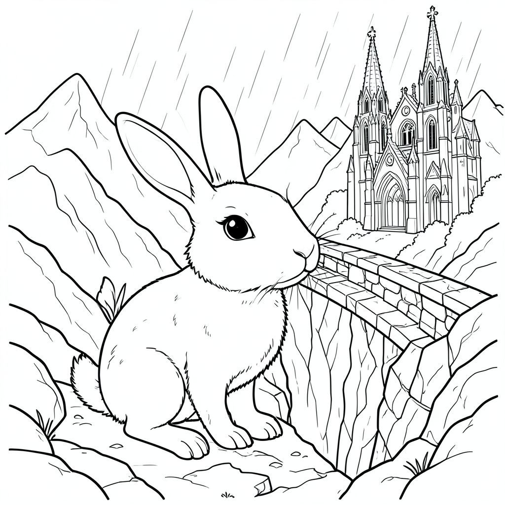 solo, chủ đề đơn, một đầu, hai mắt, hai tai, bốn chân, một đuôi, tỷ lệ tự nhiên, quy mô thích hợp trong môi trường, đúng giải phẫu, thỏ, Sương mù, núi, vực thẳm, cầu, đá, phong hóa, bóng tối, Gothic, Nhà thờ, mưa, trang màu, nghệ thuật đường, nền trắng, solo, chủ đề đơn, đúng về mặt giải phẫu, giải phẫu hoàn hảo