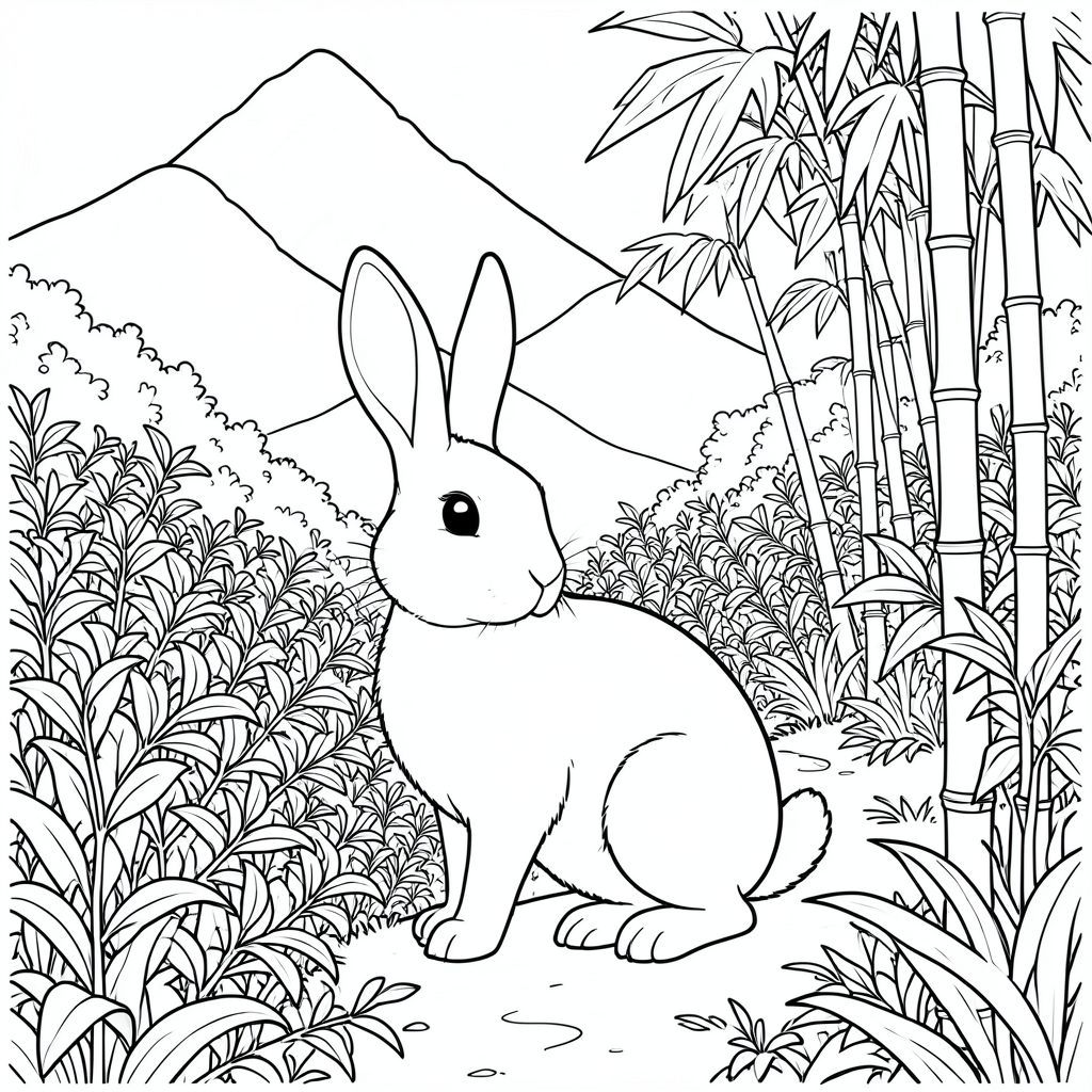 solo, chủ đề đơn, một đầu, hai mắt, hai tai, bốn chân, một đuôi, tỷ lệ tự nhiên, quy mô thích hợp trong môi trường, đúng giải phẫu, thỏ, sương mù, sườn nhiệt đới, núi, cây trà, tán lá rậm rạp, ánh sáng mặt trời, lốm đốm, con đường quanh co, tre, thân cây cao, trang màu, nghệ thuật đường nét, nền trắng, solo, chủ đề đơn, đúng giải phẫu, giải phẫu hoàn hảo