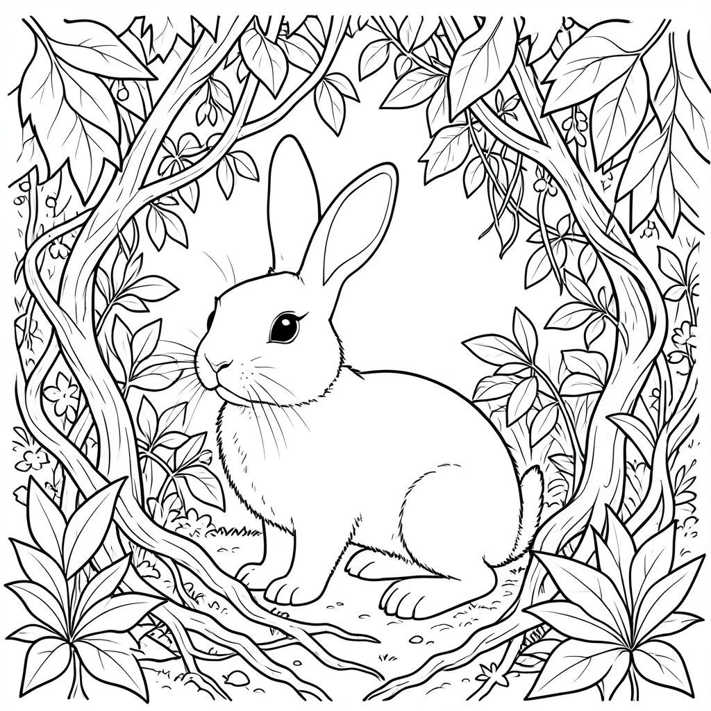 solo, chủ đề đơn, một đầu, hai mắt, hai tai, bốn chân, một đuôi, tỷ lệ tự nhiên, quy mô thích hợp trong môi trường, đúng giải phẫu, thỏ, tán lá rậm rạp, tán cây, dây leo, rối, rễ, thực vật biểu sinh, ánh sáng mặt trời, lốm đốm, kết cấu, lá, trang màu, nghệ thuật đường nét, nền trắng, solo, chủ đề đơn, đúng giải phẫu, giải phẫu hoàn hảo