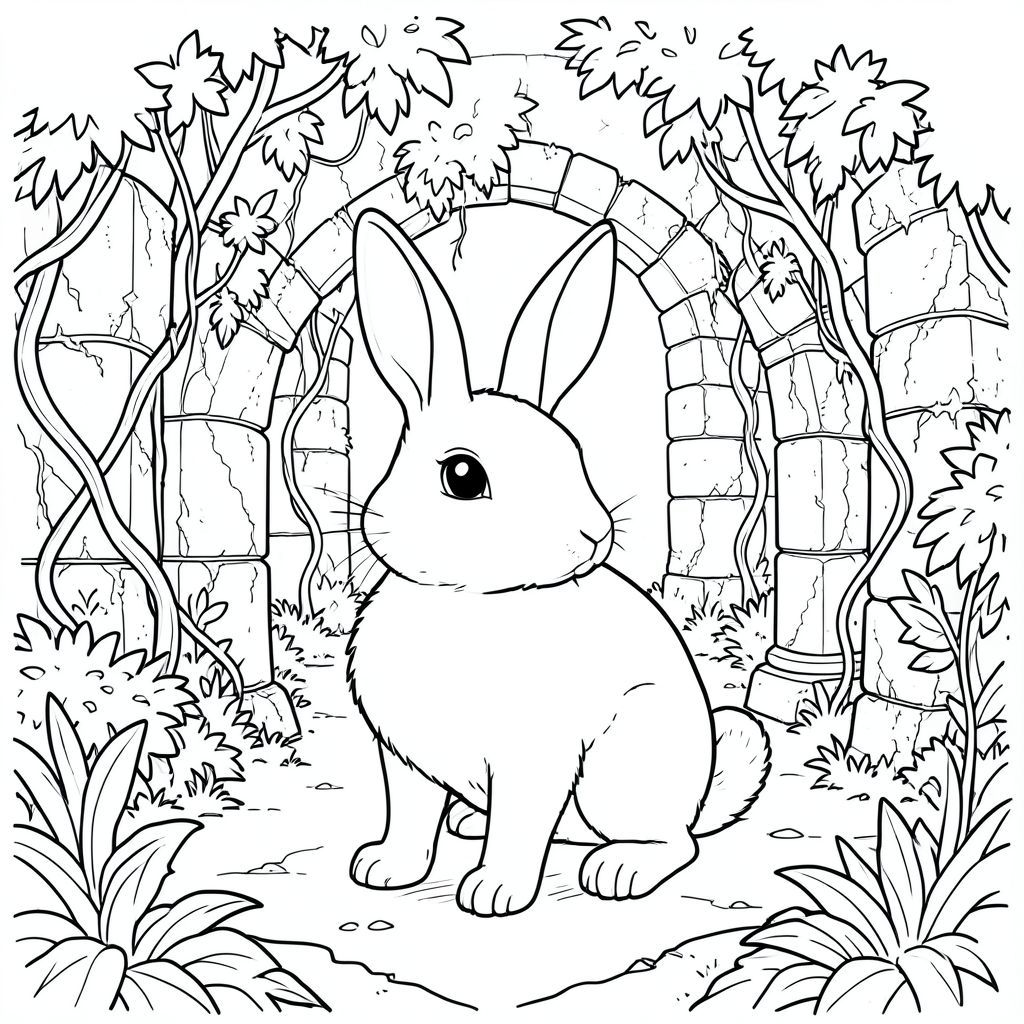 solo, chủ đề đơn, một đầu, hai mắt, hai tai, bốn chân, một đuôi, tỷ lệ tự nhiên, quy mô thích hợp trong môi trường, đúng giải phẫu, thỏ, Tàn tích đá cổ, dây leo mọc um tùm, tán lá dày, tường đổ nát, đá phong hóa, bề mặt rêu, lọc ánh sáng mặt trời, vòm vỡ, trụ sụp đổ, mặt đất không bằng phẳng, trang màu, nghệ thuật đường, nền trắng, solo, chủ đề đơn, đúng giải phẫu, giải phẫu hoàn hảo