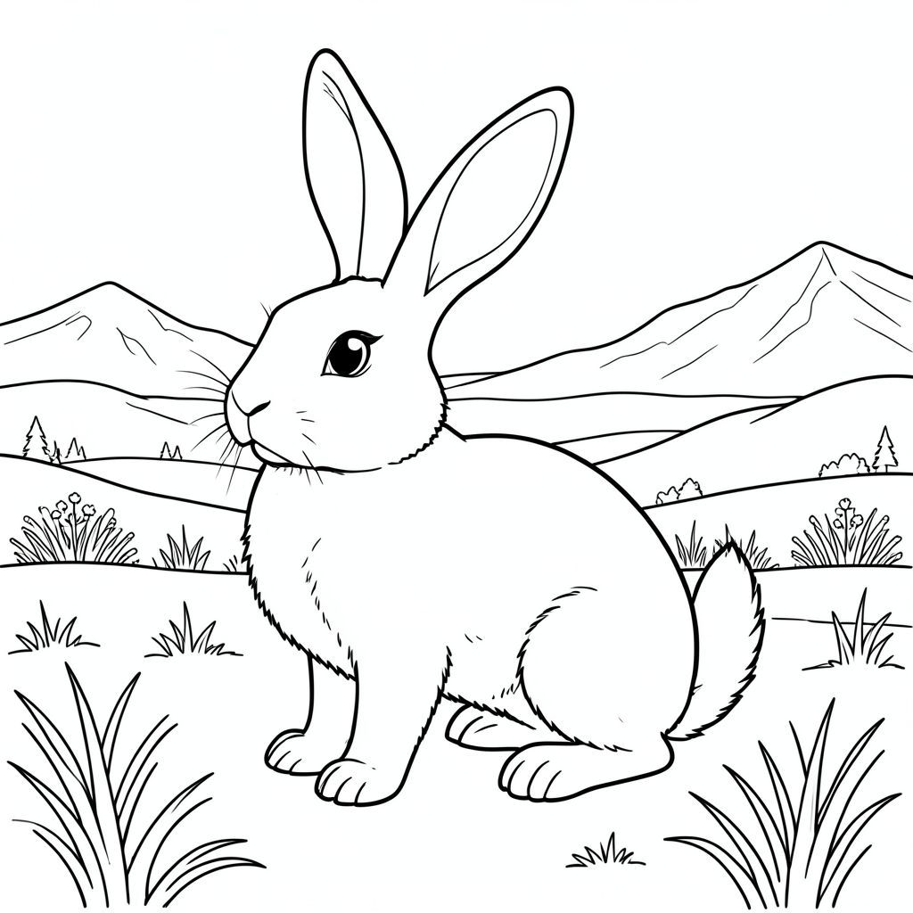 solo, chủ đề đơn, một đầu, hai mắt, hai tai, bốn chân, một đuôi, tỷ lệ tự nhiên, quy mô thích hợp trong môi trường, đúng giải phẫu, thỏ, thảo nguyên, tuyết, cỏ, núi, xa, phong cảnh, mùa đông, bầu trời quang đãng, rộng lớn, mở, tô màu, nghệ thuật đường, nền trắng, solo, chủ đề đơn, đúng giải phẫu, giải phẫu hoàn hảo