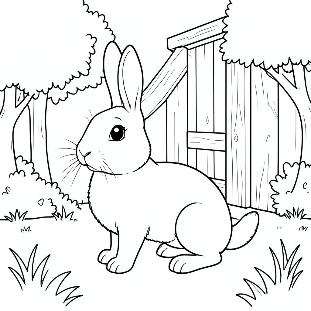 solo, chủ đề đơn, một đầu, hai mắt, hai tai, bốn chân, một đuôi, tỷ lệ tự nhiên, quy mô thích hợp trong môi trường, đúng giải phẫu, thỏ, Tường chuồng, cấu trúc bằng gỗ, nhỏ, đơn giản, dọn dẹp, lý lịch, không gian mở, tán lá, cây, cỏ, trang tô màu, nghệ thuật đường, nền trắng, solo, chủ đề đơn, đúng về mặt giải phẫu, giải phẫu hoàn hảo