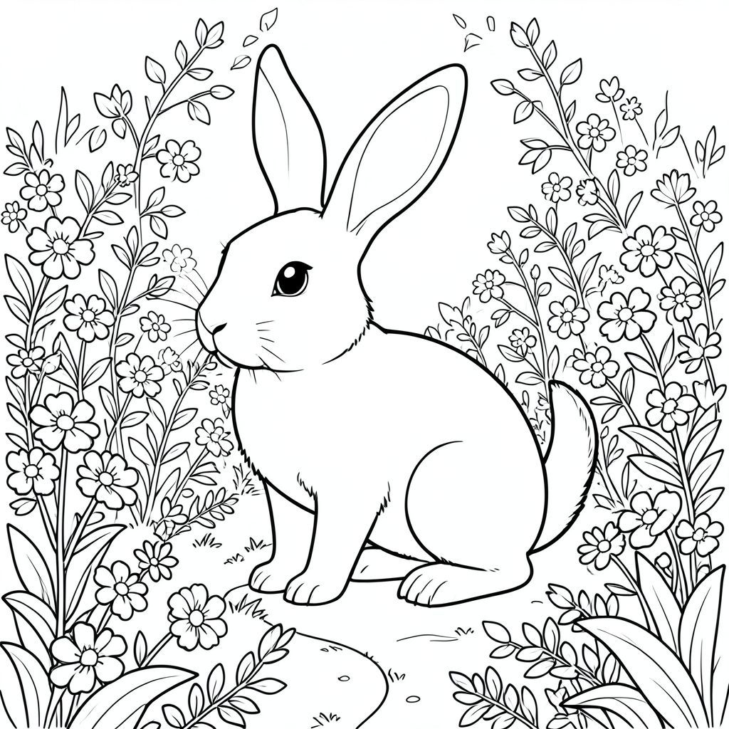 solo, chủ đề đơn, một đầu, hai mắt, hai tai, bốn chân, một đuôi, tỷ lệ tự nhiên, quy mô thích hợp trong môi trường, đúng giải phẫu, thỏ, vườn, đường quanh co, lót hoa, cây xanh tươi tốt, ánh sáng mặt trời, tán lá chi tiết, con đường, thiết kế phức tạp, yên bình, thanh bình, trang màu, nghệ thuật đường, nền trắng, solo, chủ đề đơn, đúng giải phẫu, giải phẫu hoàn hảo