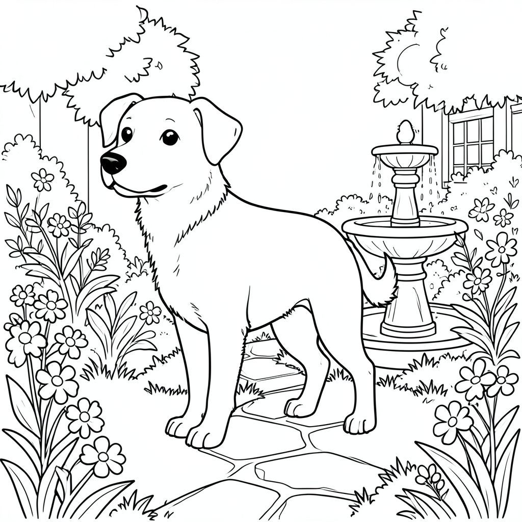 solo, chủ đề đơn, một đầu, hai mắt, hai tai, bốn chân, một đuôi, tỷ lệ tự nhiên, quy mô thích hợp trong môi trường, đúng giải phẫu,, vườn, sân, thực vật, đài phun nước, đá, con đường, cỏ, hoa, ánh sáng mặt trời, đơn giản, trang màu, nghệ thuật đường, nền trắng, solo, chủ đề đơn, đúng về mặt giải phẫu, giải phẫu hoàn hảo