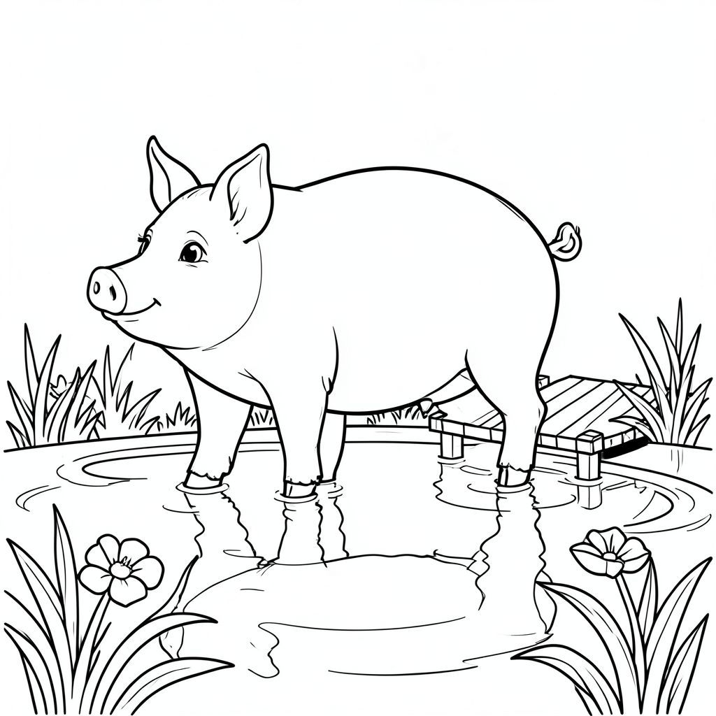 solo, chủ đề đơn, một đầu, hai mắt, hai tai, bốn chân, một đuôi, tỷ lệ tự nhiên, quy mô thích hợp trong môi trường, đúng về mặt giải phẫu, Con lợn, Ao hoa huệ, miếng đệm, bến tàu nhỏ, Nước, ánh sáng mặt trời, rõ ràng, mịn màng, phản chiếu, điềm tĩnh, yên bình, trang màu, nghệ thuật đường nét, nền trắng, solo, chủ đề đơn, đúng về mặt giải phẫu, giải phẫu hoàn hảo