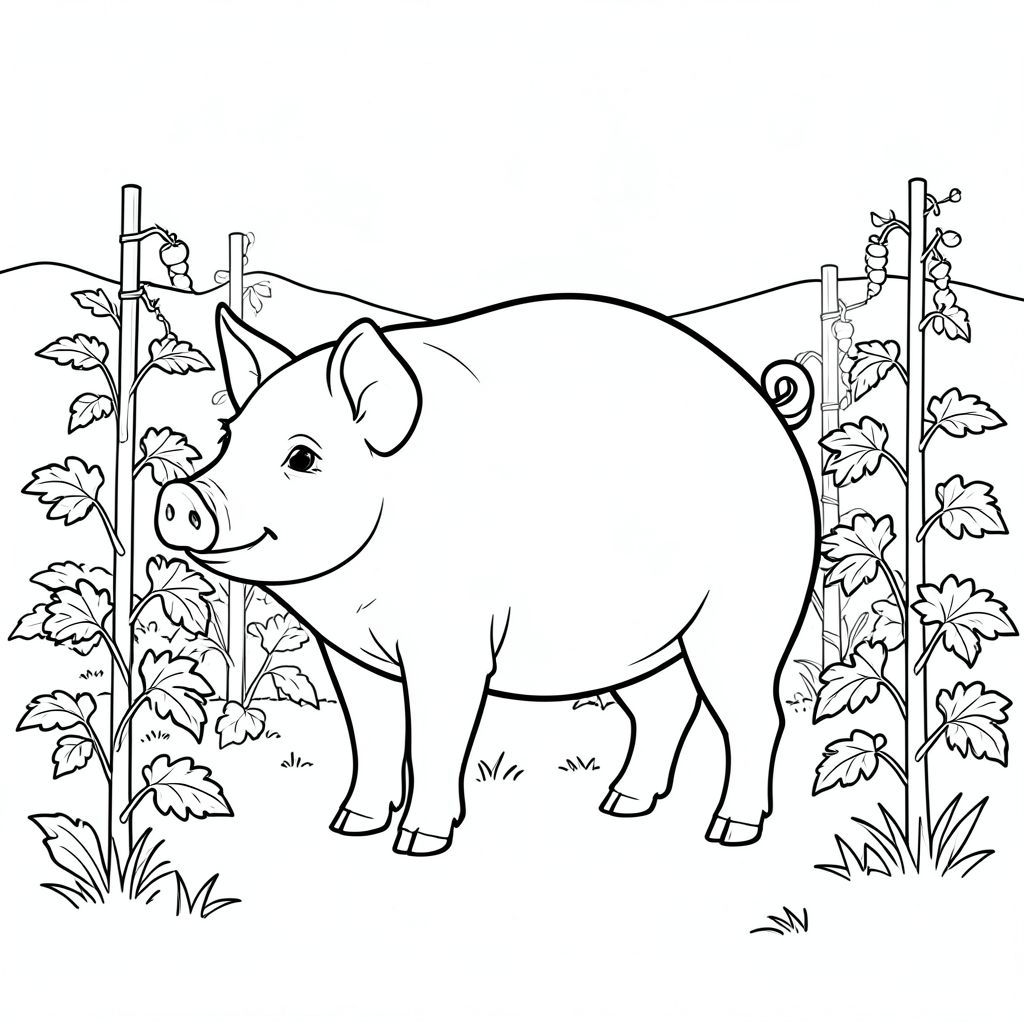 solo, chủ đề đơn, một đầu, hai mắt, hai tai, bốn chân, một đuôi, tỷ lệ tự nhiên, quy mô thích hợp trong môi trường, đúng về mặt giải phẫu, Con lợn, Vườn rau, cọc cà chua, cột đậu, nền đơn giản, môi trường sạch sẽ, nhỏ, khắc, tinh khiết, trang màu, nghệ thuật đường, nền trắng, solo, chủ đề đơn, đúng về mặt giải phẫu, giải phẫu hoàn hảo