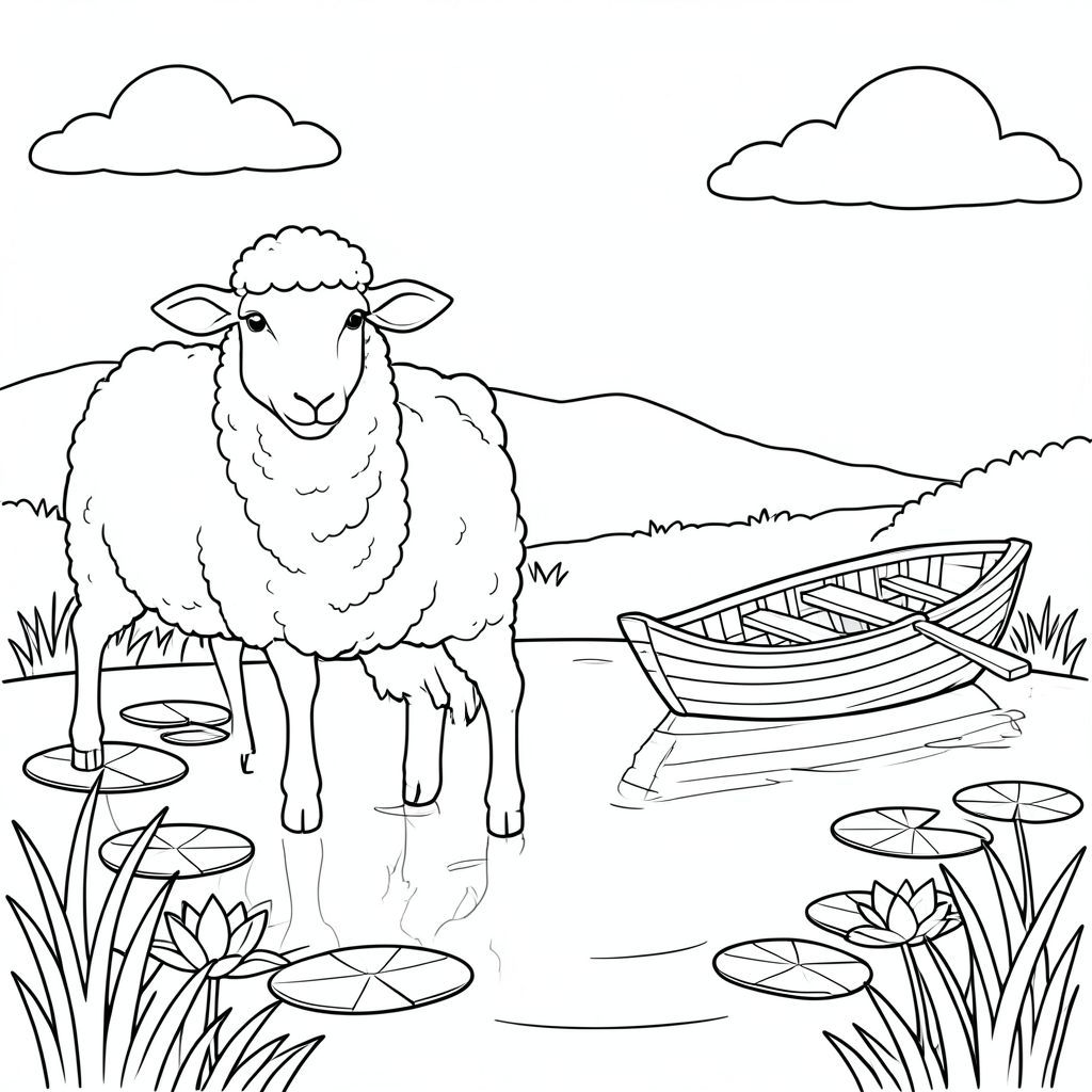solo, chủ đề đơn, một đầu, hai mắt, hai tai, bốn chân, một đuôi, tỷ lệ tự nhiên, quy mô thích hợp trong môi trường, đúng về mặt giải phẫu, Cừu, ao, miếng đệm hoa loa kèn, thuyền chèo bằng gỗ, nước lặng, cỏ, ánh sáng mặt trời, bầu trời quang đãng, bầu trời, nền đơn giản, đường sạch, trang màu, nghệ thuật đường, nền trắng, solo, chủ đề đơn, chính xác về mặt giải phẫu, giải phẫu hoàn hảo