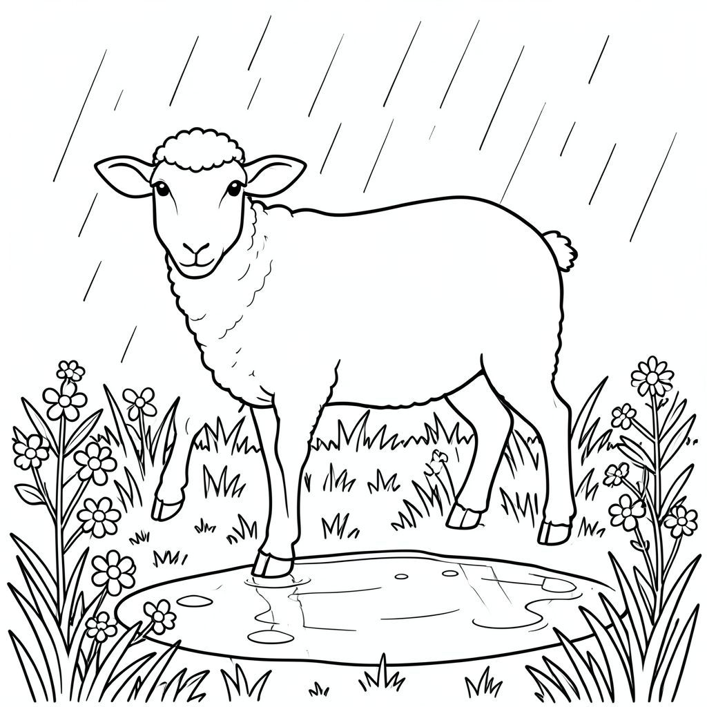 solo, chủ đề đơn, một đầu, hai mắt, hai tai, bốn chân, một đuôi, tỷ lệ tự nhiên, quy mô thích hợp trong môi trường, đúng về mặt giải phẫu, Cừu, Đồng cỏ, hoa dại, vũng nước, mưa, ánh sáng mặt trời, cỏ, đơn giản, dọn dẹp, lý lịch, rõ ràng, trang màu, nghệ thuật đường, nền trắng, solo, chủ đề đơn, đúng về mặt giải phẫu, giải phẫu hoàn hảo