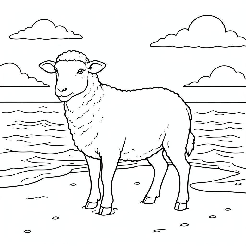 solo, chủ đề đơn, một đầu, hai mắt, hai tai, bốn chân, một đuôi, tỷ lệ tự nhiên, quy mô thích hợp trong môi trường, đúng về mặt giải phẫu, Cừu, Hoàng hôn, bờ biển, sóng, cát, ướt, trong sáng, Bầu trời, những đám mây, nhẹ nhàng, mềm mại, Trang màu, nghệ thuật đường, nền trắng, Solo, chủ đề đơn, đúng về mặt giải phẫu, giải phẫu hoàn hảo