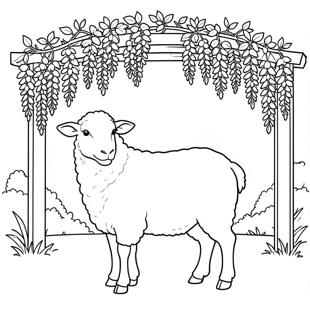 solo, chủ đề đơn, một đầu, hai mắt, hai tai, bốn chân, một đuôi, tỷ lệ tự nhiên, quy mô thích hợp trong môi trường, đúng về mặt giải phẫu, Cừu, Pergola, hoa tử đằng, nở hoa, Cụm treo, vườn, đơn giản, sạch sẽ, lý lịch, thoáng mát, Bầu trời, trang màu, nghệ thuật đường, nền trắng, solo, chủ đề đơn, chính xác về mặt giải phẫu, giải phẫu hoàn hảo