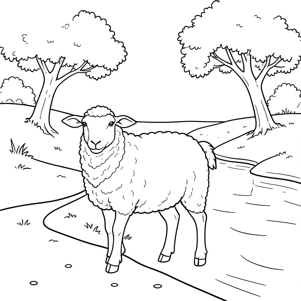 solo, chủ đề đơn, một đầu, hai mắt, hai tai, bốn chân, một đuôi, tỷ lệ tự nhiên, quy mô thích hợp trong môi trường, đúng về mặt giải phẫu, Cừu, Sông, uốn cong, cát, ngân hàng, cây, Ánh sáng mặt trời, rõ ràng, điềm tĩnh, Nước, mịn, trang màu, nghệ thuật đường, nền trắng, solo, chủ đề đơn, đúng về mặt giải phẫu, giải phẫu hoàn hảo