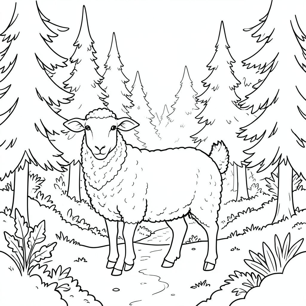 solo, chủ đề đơn, một đầu, hai mắt, hai tai, bốn chân, một đuôi, tỷ lệ tự nhiên, quy mô thích hợp trong môi trường, đúng về mặt giải phẫu, Cừu, sương mù, rừng thông, ánh sáng mặt trời, bầu trời quang đãng, dày đặc, cây cối, lá, rêu, mặt đất, đường dẫn, trang tô màu, nghệ thuật đường, nền trắng, solo, chủ đề đơn, đúng về mặt giải phẫu, giải phẫu hoàn hảo