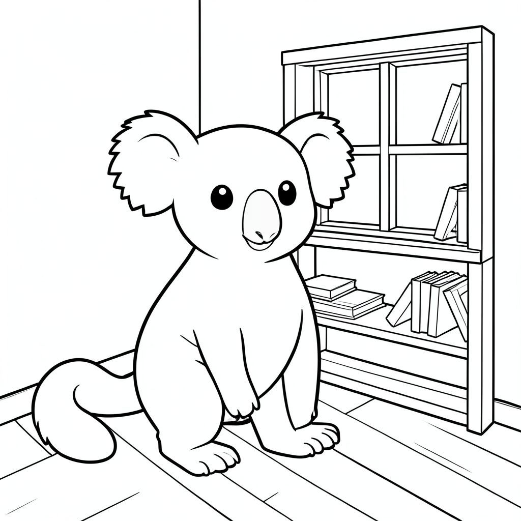 solo, chủ đề đơn, một đầu, hai mắt, hai tai, bốn chân, một đuôi, tỷ lệ tự nhiên, quy mô thích hợp trong môi trường, đúng về mặt giải phẫu, Koala, Kệ đồ chơi, chỗ ngồi cửa sổ, sàn nhà, bằng gỗ, đơn giản, sạch sẽ, không gian, nhỏ, phòng, sách, trang màu, nghệ thuật đường, nền trắng, solo, chủ đề đơn, đúng về mặt giải phẫu, giải phẫu hoàn hảo