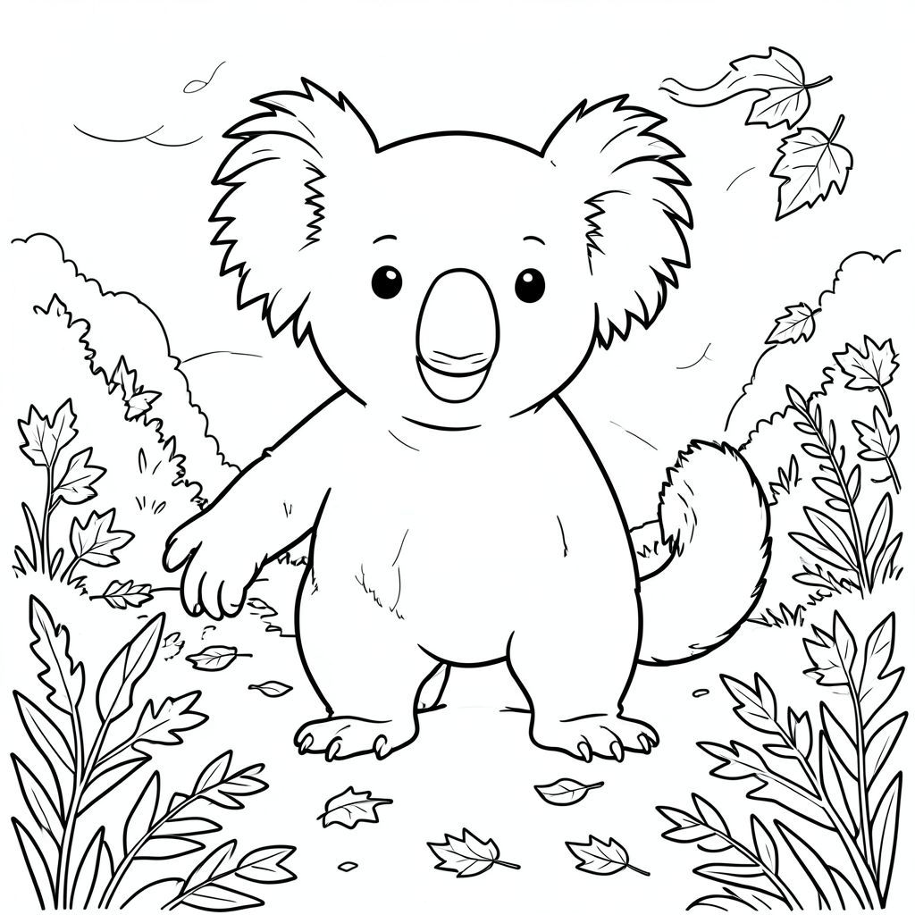 solo, chủ đề đơn, một đầu, hai mắt, hai tai, bốn chân, một đuôi, tỷ lệ tự nhiên, quy mô thích hợp trong môi trường, đúng về mặt giải phẫu, Koala, Lá mùa thu, gió, con đường, tán lá, thổi, rải rác, khô, trong sáng, Bầu trời, u ám, trang tô màu, nghệ thuật đường, nền trắng, solo, chủ đề đơn, đúng về mặt giải phẫu, giải phẫu hoàn hảo