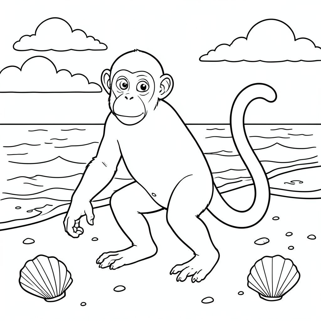 solo, Linh trưởng đơn, hai cánh tay, hai chân, một đuôi, đúng giải phẫu, khỉ, Bãi biển cát, sóng, vỏ sò, cát, ánh sáng mặt trời, nước trong, bầu trời, đám mây, đường chân trời, bờ biển, trang màu, nghệ thuật đường nét, nền trắng, solo, chủ đề đơn, chính xác về mặt giải phẫu, giải phẫu hoàn hảo