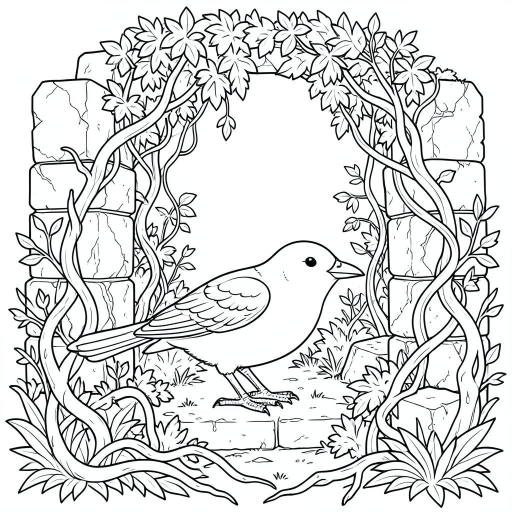 solo, một con chim, hai chân, hai cánh, một mỏ, chính xác về mặt giải phẫu, chim, Tàn tích cổ, đá, Phong hóa, mọc um tùm, dây leo, dày, tán lá, dày đặc, rối, vỡ vụn, trang màu, nghệ thuật đường, nền trắng, solo, chủ đề đơn, đúng giải phẫu, giải phẫu hoàn hảo