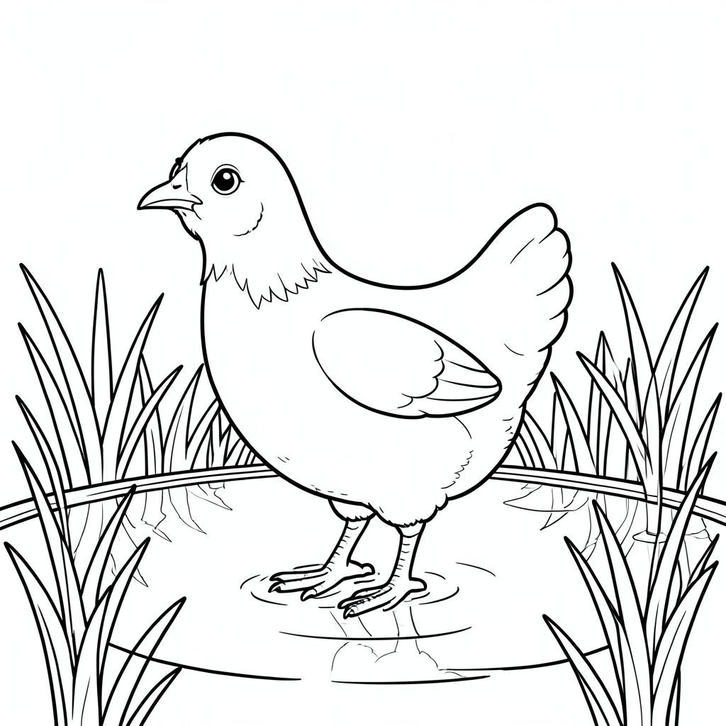 solo, một con chim, một đầu, hai mắt, một mỏ, hai cánh, hai chân, một đuôi, tỷ lệ tự nhiên, quy mô thích hợp trong môi trường, chính xác về mặt giải phẫu, gà, ao, nước, lau sậy, ánh sáng mặt trời, trong sáng, điềm tĩnh, mịn, phản chiếu, nhỏ, đơn giản, tô màu, nghệ thuật đường, nền trắng, solo, chủ đề đơn, chính xác về mặt giải phẫu, giải phẫu hoàn hảo
